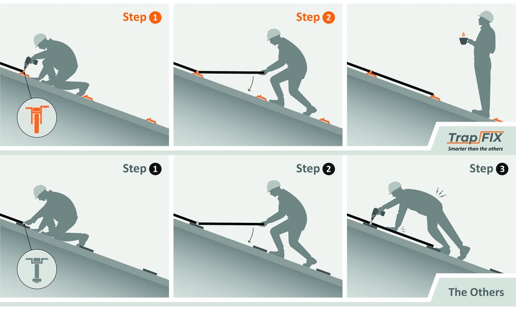 Modulmontage auf Trapezblechdächern - Schnelle und spannungsfreie Montage - Für verschiedene Rahmenhöhen - Umgehung von Dachbefestigungsschrauben durch eine simple 180° Drehung - Integrierte Kabelanbindung - Sehr wenig Platzbedarf in der Lagerung