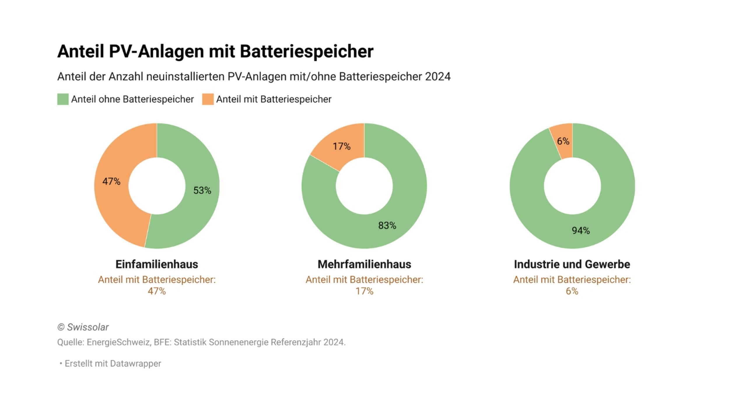 Gleichzeitig gewinnen Batteriespeicher weiter an Bedeutung: Sie steigern den Eigenverbrauch, reduzieren Netzlastspitzen und erhöhen die Wirtschaftlichkeit von PV-Anlagen. 2024 wurden bereits 47 % aller neuen Einfamilienhausanlagen mit einem Speicher ausgestattet – ein klarer Trend, der sich fortsetzt.