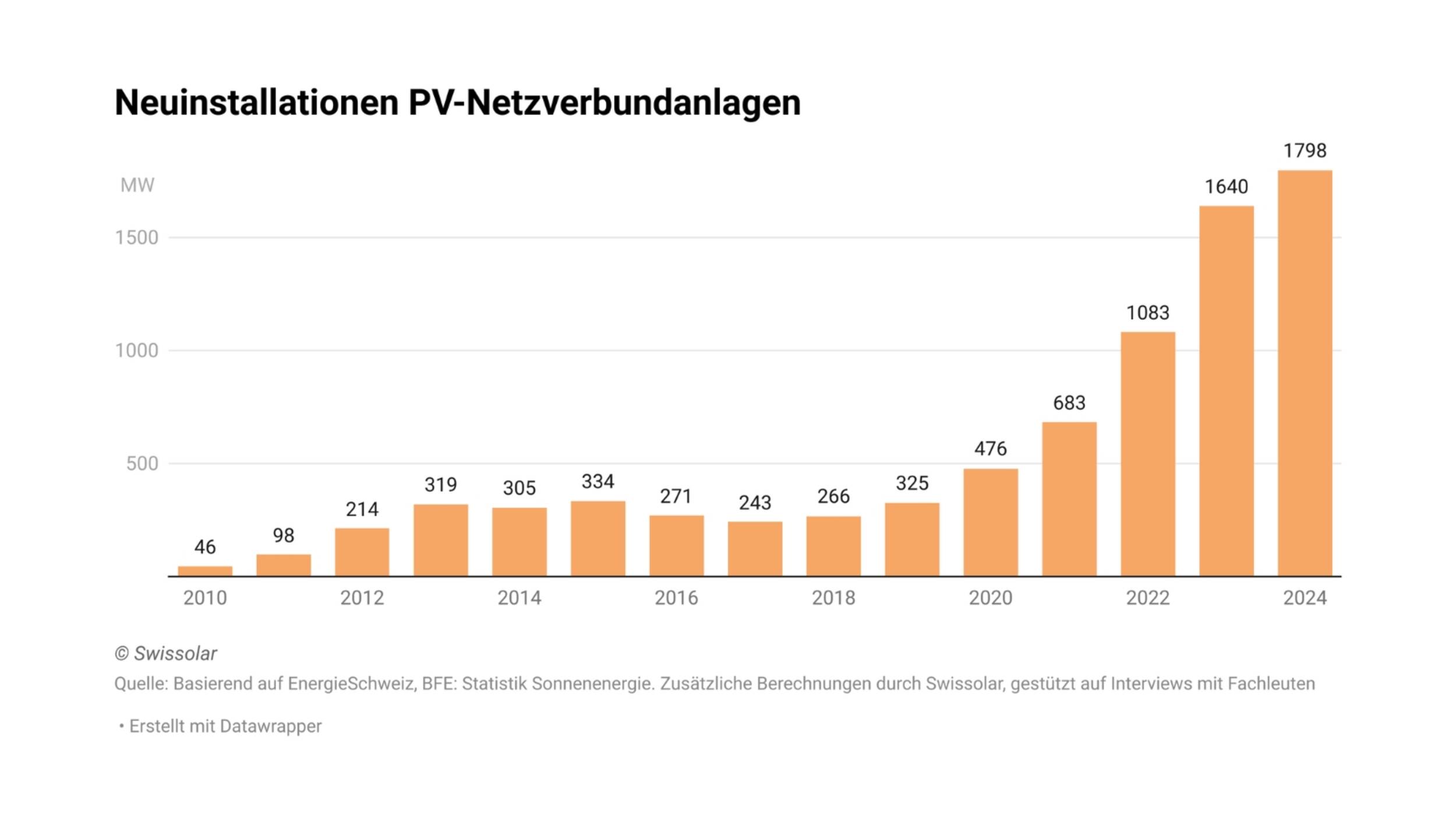 Grafik Neuinstallationen PV-Netzverbundanlagen: Der Rekord 2024 markiert den Höhepunkt eines dynamischen Wachstums.