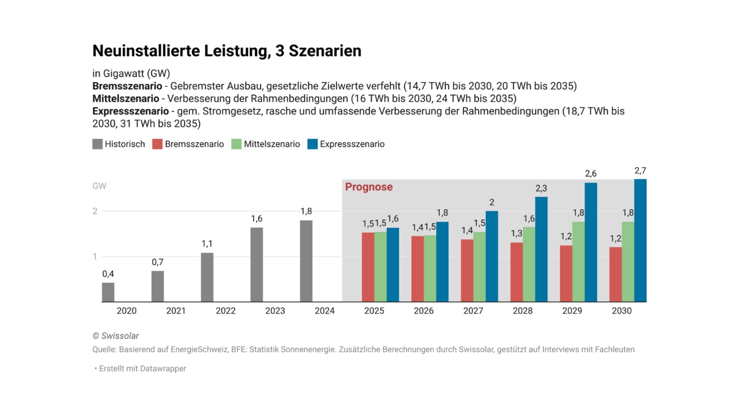 Grafik Neuinstallierte Leistung, drei Szenarien: Ob die Schweiz ihre Solarziele erreicht, hängt entscheidend von stabilen politischen und wirtschaftlichen Voraussetzungen ab.