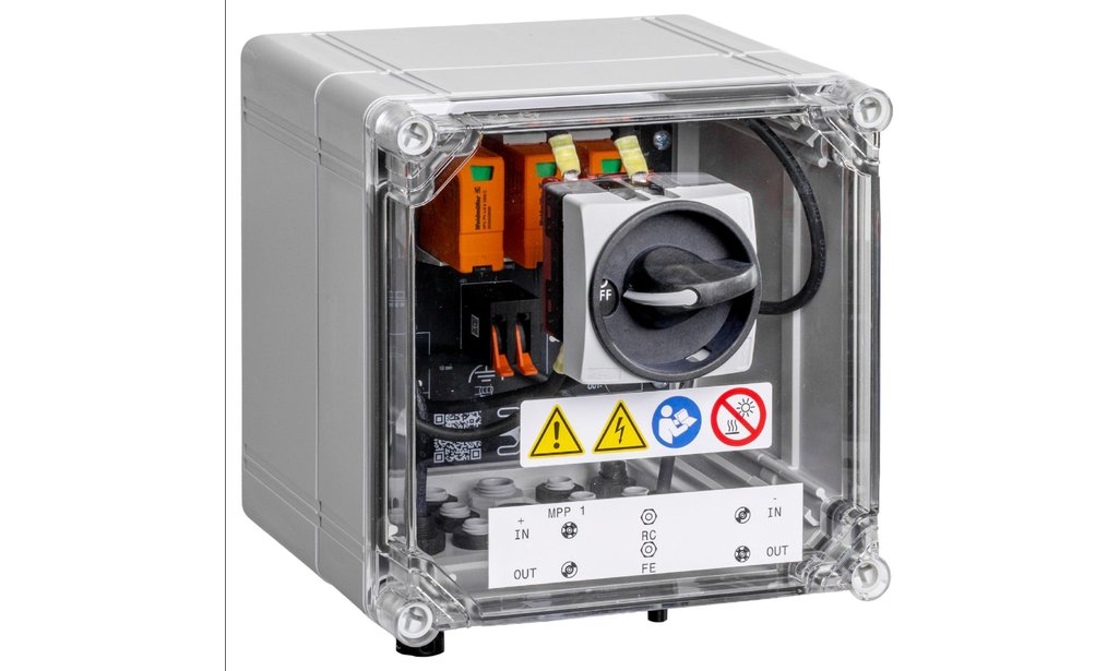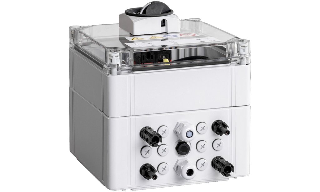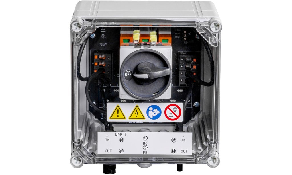 PV Generatoranschlusskasten: 1 MPPT, 1IN/MPPT, 1OUT/MPPT, Überspannungsableiter TYP I/II, DC-Trennschalter, Stäubli-EVO2 Stecker-Anschluss, Signalkontakt, Maximaler Strom pro Ausgang und MPPT 35 A, DC Bemessungsspannung (Un) 1'100 V.