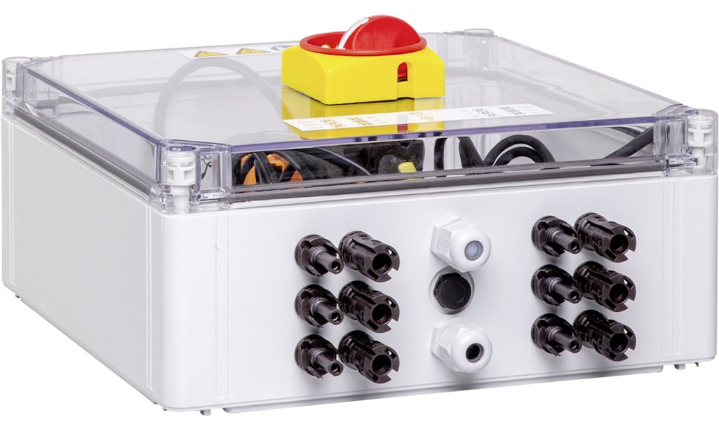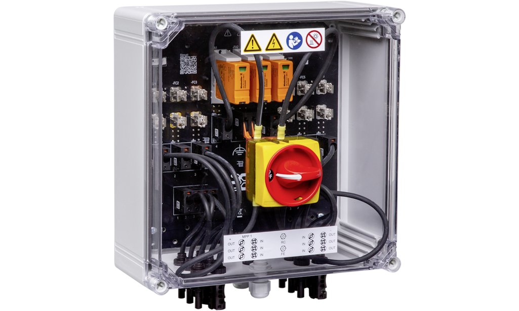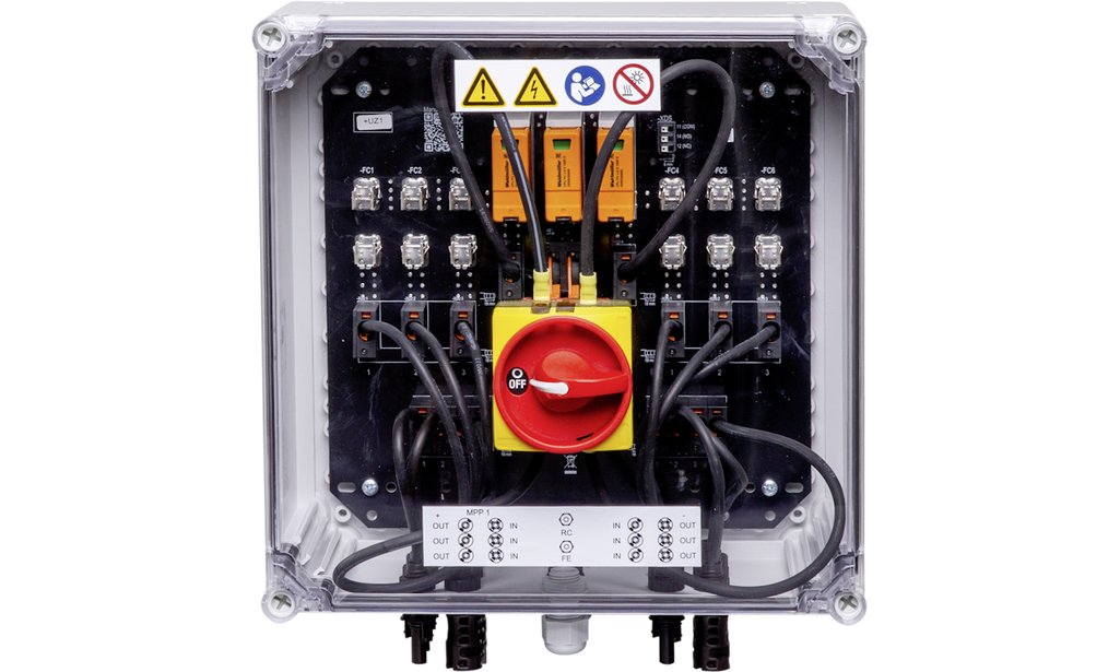 PV Generatoranschlusskasten: 1 MPPT, 3IN/MPPT, 3OUT/MPPT, Überspannungsableiter TYP I/II, 3 Sicherungshalter, DC-Trennschalter, Stäubli-EVO2 Stecker-Anschluss, Signalkontakt, Maximaler Strom pro Ausgang und MPPT 45 A, DC Bemessungsspannung (Un) 1'000 V. 10x38 mm Sicherungen müssen separat bestellt werden.