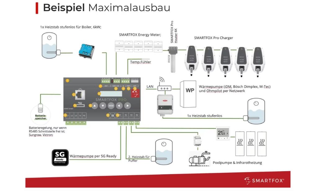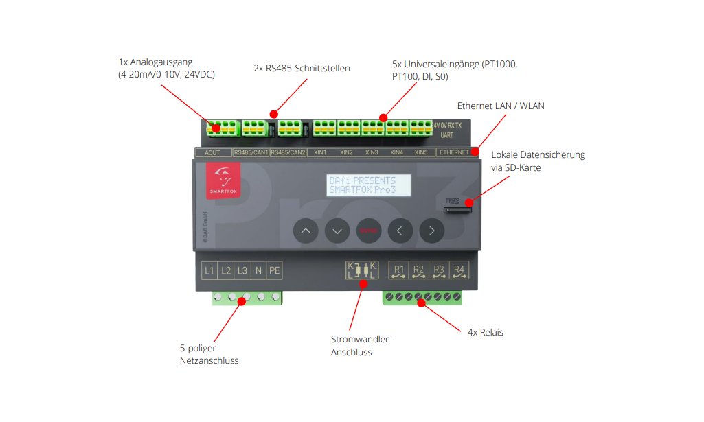 -5x Universaleingang (S0, DI, Temp.) Verschiedene Temperaturfühler (z.B. PT100, PT1000), S0-Eingänge etc. -2x RS485 Schnittstelle, mehr Flexibilität -Neue Softwarelösungen mit überarbeitetem Einstellungskonzept -Intuitive Prioritätenvergabe -Master und Slave (RS485) -Anbindung / Steuerung von mehr als 5 Wallboxen -Hochauflösendes Monitoring und kostenlose My SMARTFOX App - 10 Jahre Premiummonitoring inklusive