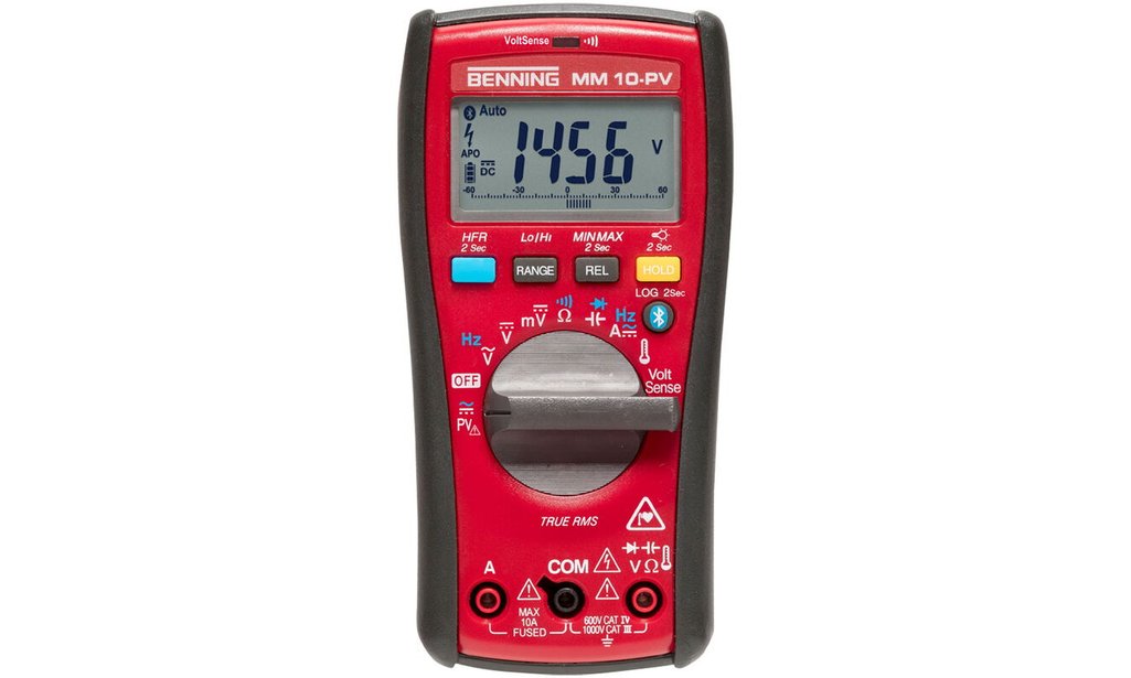 •Mesure de tension jusqu’à 1'500 V CA/2'000 V CC via l’adaptateur de mesure TA PV •Précision grâce à la méthode de mesure de la valeur efficace réelle TRUE RMS •Enregistreur de données, fonction de stockage et interface Bluetooth® Low Energy 4.0 •Application BENNING MM-CM Link pour télécharger, enregistrer et partager des valeurs de mesure via smartphone/tablette •Filtre passe-bas (suppression des hautes fréquences HFR) pour les mesures sur les entraînements à moteur synchronisés •Capteur de tension pour le contrôle sans contact de la phase et de la rupture de câble (LED rouge) •Mémoire des valeurs mesurées (HOLD) et des valeurs minimales/maximales (MIN/MAX) •Catégorie de mesure CAT IV 600 V, CAT III 1'000 V