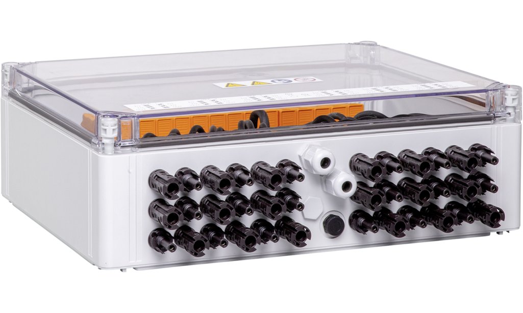 Boîte de jonction de générateur PV : 6 MPPT, 2IN/MPPT, 1OUT/MPPT, parafoudre TYPE I/II, connecteur Stäubli-EVO2, contact de signalisation courant maximal par sortie et MPPT 41 A, tension assignée CC (Un) 1'100 V