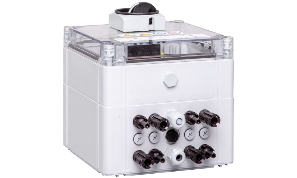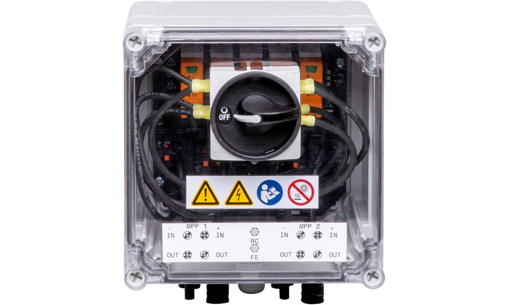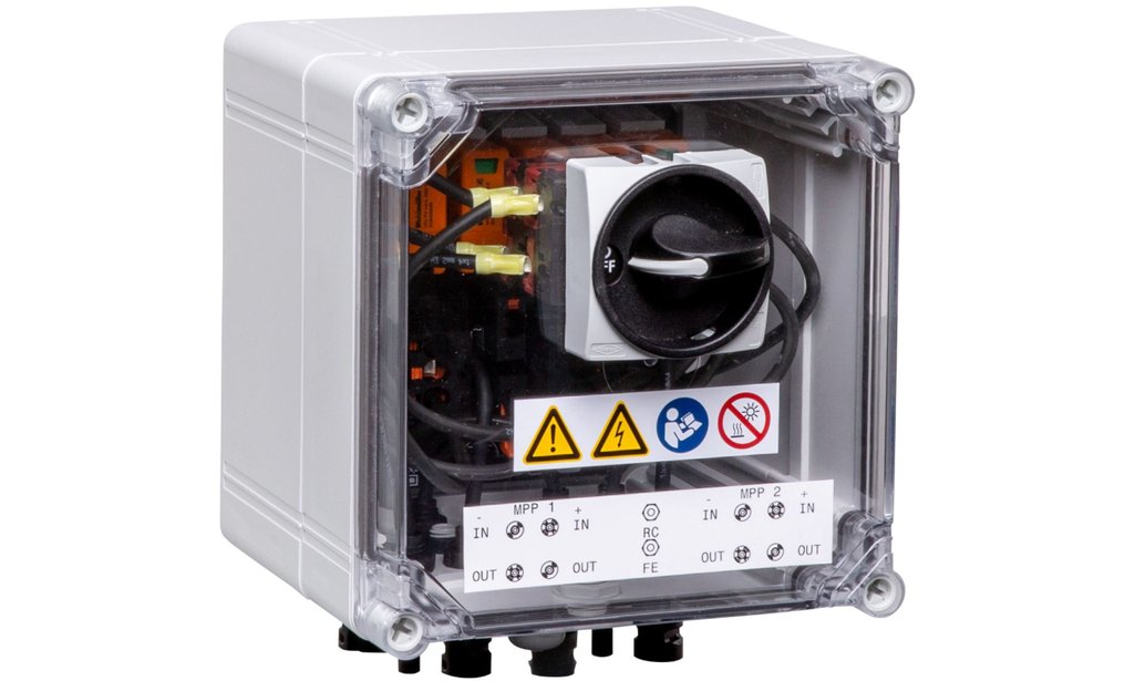 Boîte de jonction de générateur PV : 2 MPPT, 1IN/MPPT, 1OUT/MPPT, parafoudre TYPE I/II, sectionneur CC, connecteur EVO2 Stäubli, contact de signalisation, courant maximal par sortie et MPPT 35 A, tension assignée CC (Un) 1'100 V.