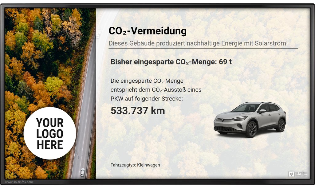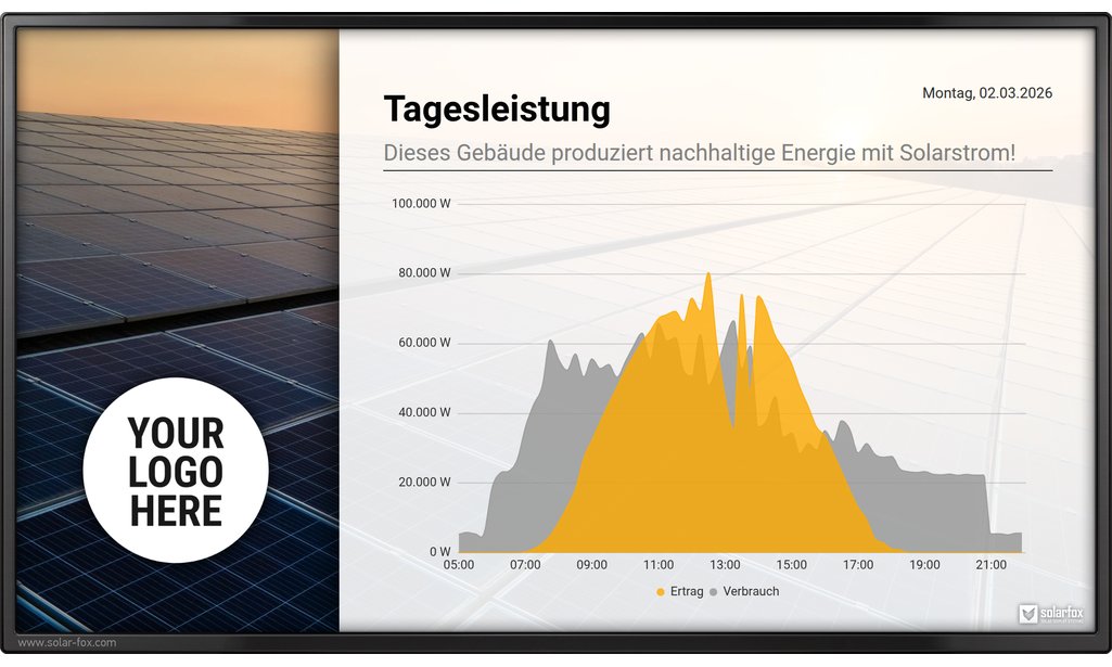 La série Solarfox® SF-600 est un affichage photovoltaïque performant et résistant aux intempéries, destiné à une utilisation en extérieur, qui affiche en temps réel l'énergie solaire produite, les économies de CO₂, ainsi que, en option, la consommation d'électricité, l'état de la batterie et le taux d'autonomie. Grâce à sa forte luminosité, l'affichage reste clair et lisible même en plein soleil, ce qui le rend idéal pour les lieux très fréquentés dans l'espace public. Avec une luminosité de 3 500 cd/m², un boîtier anti-vandalisme doté d'un verre de sécurité (IK10) et un indice de protection IP56, l'écran est conçu pour un fonctionnement continu 24 h/24 et 7 j/7 dans des conditions difficiles. Il est parfaitement adapté à une utilisation sur les bâtiments d'entreprise, dans les écoles, les parkings ou dans les halls d'entrée des mairies et des services municipaux. Tous les contenus peuvent être gérés de manière simple et flexible via le portail en ligne Solarfox®. Outre les données énergétiques, il est également possible d’afficher des prévisions météorologiques, des publicités, des offres d’emploi, des messages d’accueil ou des informations personnalisées.