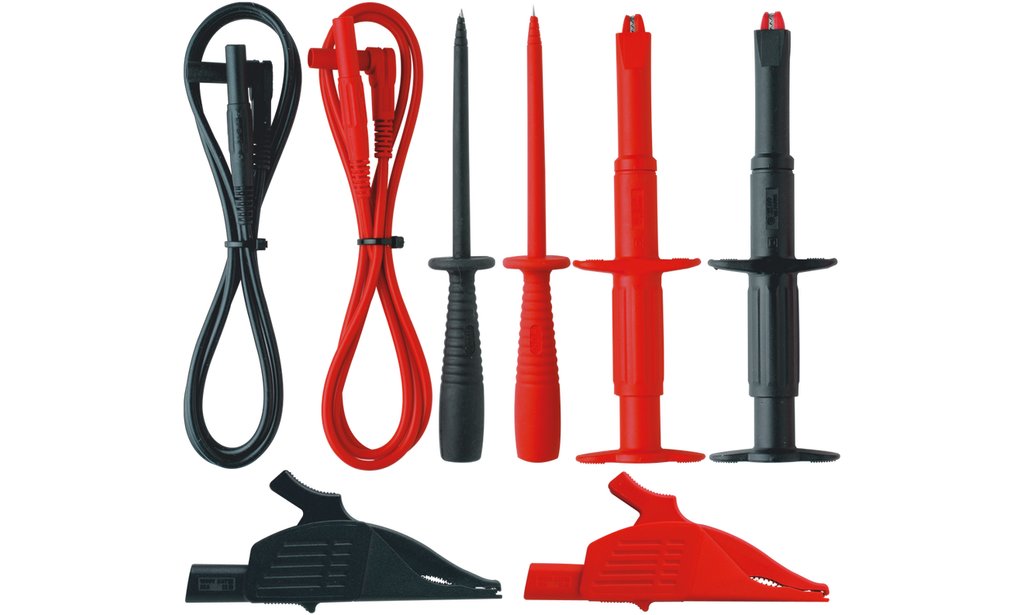 Ø 4 mm set di cavi di misura, 8 pezzi, rosso/nero, versione professionale, CAT III 1'000 V, composto da: cavi di misura (silicone), punte di prova (punta di misura snella), pinze ad artiglio, morsetti a coccodrillo (044126)