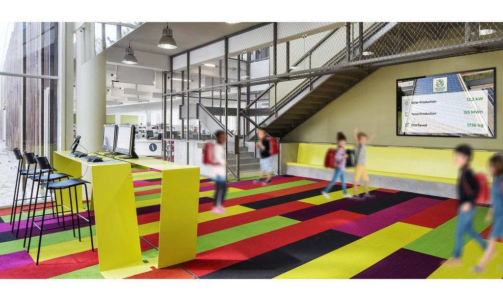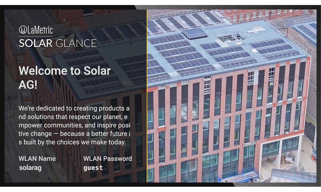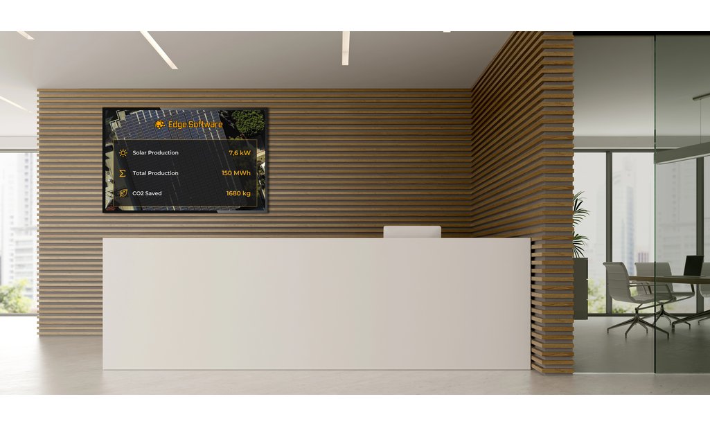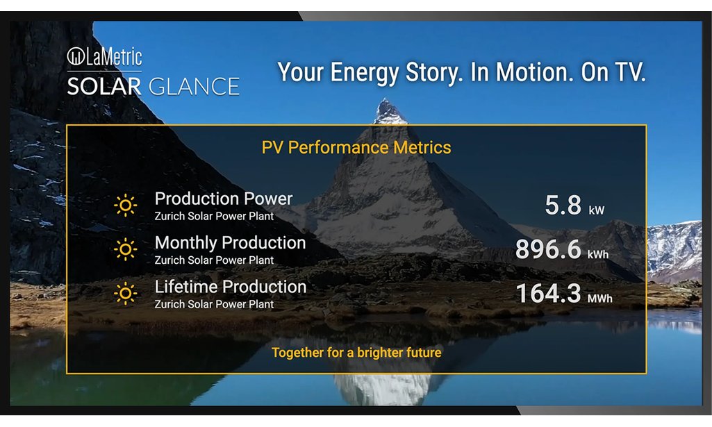 Per il collegamento di schermi esterni tramite HDMI fino a 65" LaMetric Solar GLANCE visualizza i dati solari in tempo reale su accattivanti display pubblici. Mostra la produzione, il consumo, i risparmi di CO₂ e altri indicatori ESG. La soluzione è completamente personalizzabile, supporta numerosi inverter e consente l'integrazione di contenuti, video e messaggi del marchio per un'immagine professionale e orientata alla sostenibilità. LaMetric EDGE Box può essere collegata a display commerciali da 24 a 75 pollici, offrendo così la massima flessibilità per diversi luoghi di utilizzo.
