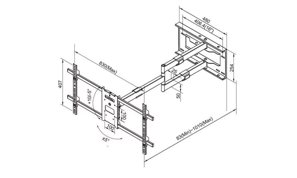 Per schermi con diagonale da 42 a 75" Capacità di carico massima di 40 kg VESA da 100 x 100 a 800 x 400 Inclinabile da -5° a +10° Orientabile di 180° Distanza dalla parete: da 83 a 1010 mm